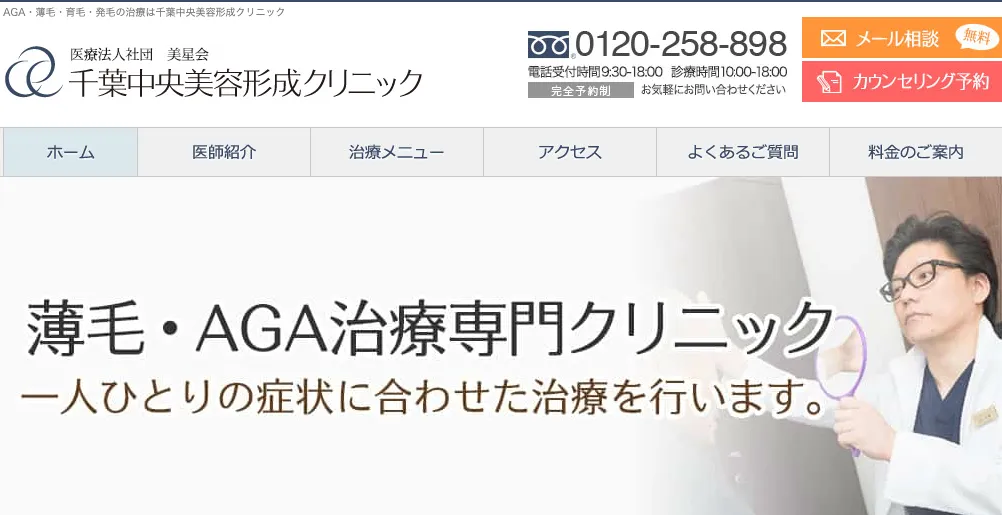 千葉中央美容形成クリニックは、JR千葉駅徒歩3分の好立地で30年以上の実績を持つ総合美容クリニック。AGA治療では、日本皮膚科学会推奨のフィナステリド・デュタステリド・ミノキシジルを中心に、一人ひとりの症状に合わせた処方を実施。